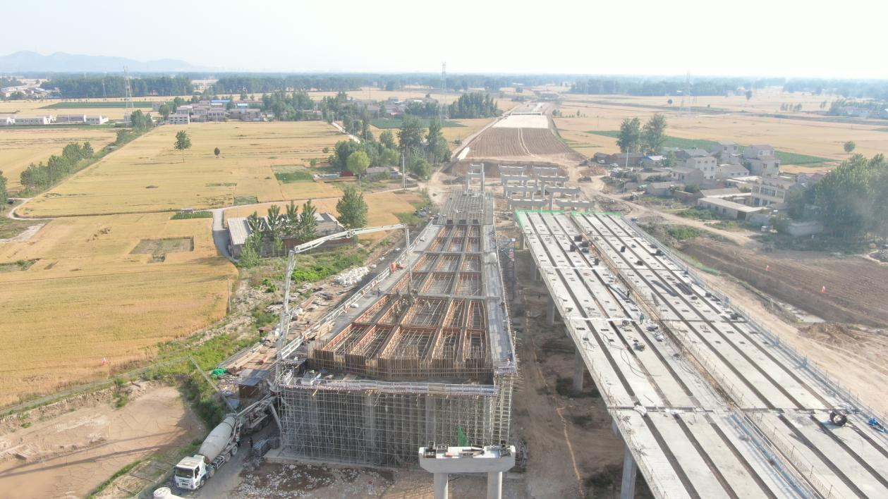 正值項(xiàng)目施工黃金季節(jié),徐淮阜高速宿州段路基工程02標(biāo)段施工現(xiàn)場(chǎng),多臺(tái)大型吊車長(zhǎng)臂揮舞,施工車輛來回穿梭,14.855公里戰(zhàn)線上,12個(gè)施工隊(duì)伍、百名作業(yè)人員、近40臺(tái)設(shè)備正緊張有序進(jìn)行路基填筑、梁板架設(shè)、現(xiàn)澆梁澆筑、橋梁立柱施工,隨處都是一派繁忙的景象。項(xiàng)目爭(zhēng)分奪秒搶進(jìn)度,工程建設(shè)速度再提升。